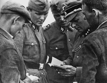 Патруль «Лейбштандарта» (во главе с унтерштурмфюрером СС) проверяет документы у местных жителей, Польша, конец сентября 1939 года.