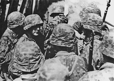 Командир «Лейбштандарта» Зепп Дитрих во время короткой передышки, рядом с ним на земле сидит Йохен Пейпер.