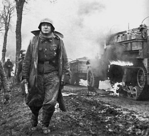 Солдат «Лейбштандарта» на фоне горящей американской техники, Арденны, 1944 год – кадр из пропагандистского фильма.