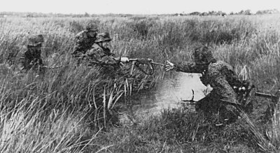 Солдаты 12-й танковой дивизии СС «Гитлерюгенд» пробираются через болото в Северной Франции, июнь 1944 года.