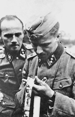 Йохен Пейпер (в пилотке) рассматривает кинопленку, Франция, июнь 1940 года – он уже произведен в гауптштурмфюреры СС, но еще не награжден Железным крестом.