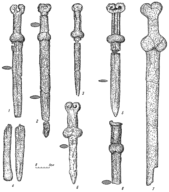 1–6 – железо; 7 – железо и бронза; 8, 9 – кость.