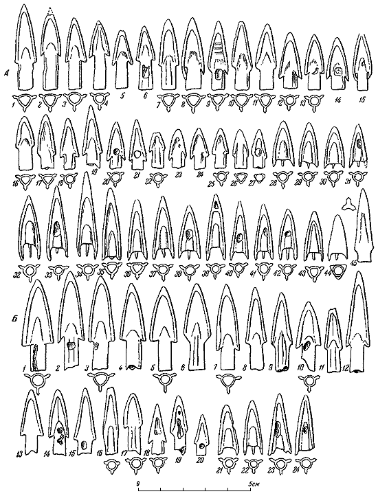 Рис. 14. Наконечники стрел из погребений второй половины VI в. до н. э. в Нижнем Поволжье.