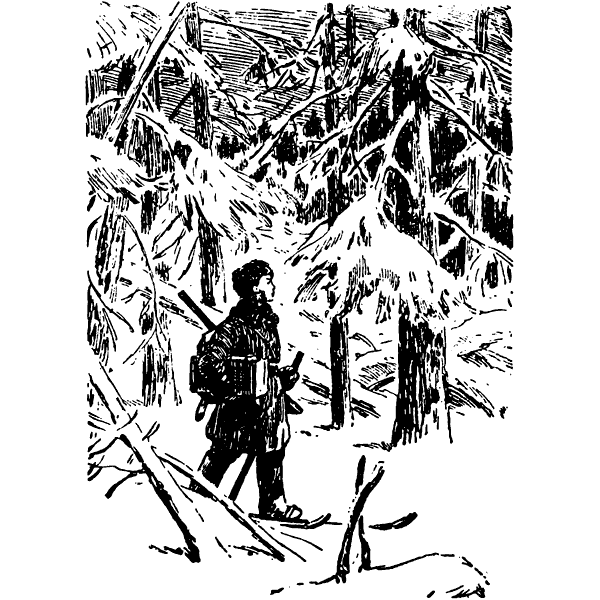 Утром он поднялся раньше всех, когда было еще совсем темно. Позавтракав, Яша стал собираться в дорогу. Он положил в рюкзак сухари, соль, котелок, спички. Подпоясавшись патронташем, засунул сзади за ремень легкий топорик, вскинул на плечо ружье и, став на лыжи, двинулся в путь.