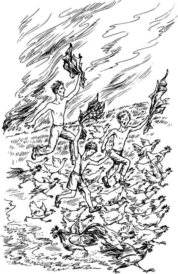 Берег ближе и ближе. Но ближе и ближе огонь. Пусть он не страшен быстроногим ребятам, но для ошалевших кур это верная гибель.