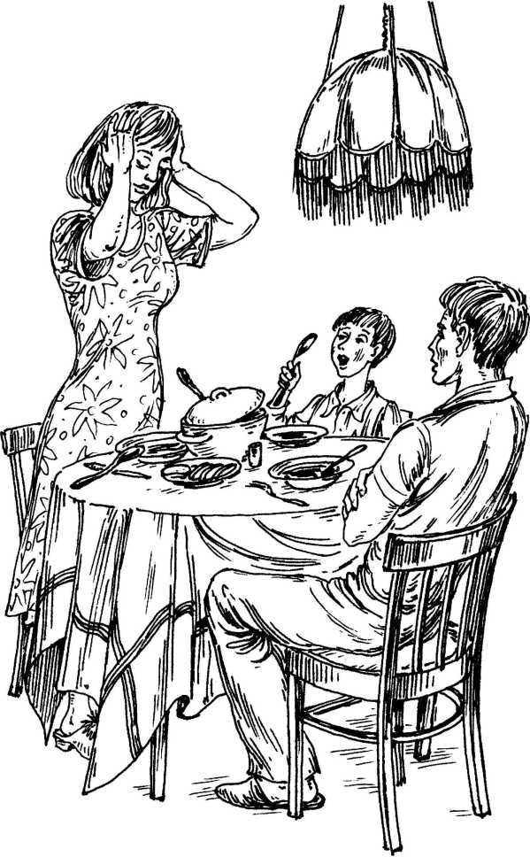 – Это очень просто, – сказал я. – Ты только послушай, мама, как все складно получается! Смотри: вот обед готов. Ты сразу ставишь один прибор. Ставишь ты, значит, единственный прибор, наливаешь в тарелку супу, садишься за стол, начинаешь есть и говоришь папе: «Обед готов!»