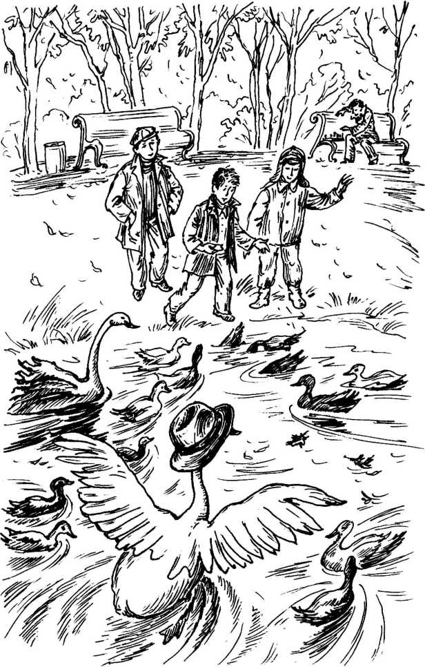 Я тоже, когда играю с папой в шахматы, ничего вокруг себя не вижу, потому что очень хочется выиграть. И вот эта шляпа взлетела, и плавно так начала опускаться, и опустилась как раз перед теми незнакомыми ребятами, что играли на дорожке. Они оба разом протянули к ней руки. Но не тут-то было, потому что ветер! Шляпа вдруг, как живая, подпрыгнула вверх, перелетела через этих ребят и красиво спланировала прямо в пруд! Но упала она не в воду, а нахлобучилась одному лебедю прямо на голову. Утки очень испугались, и гуси тоже. Они бросились врассыпную от шляпы кто куда. А вот лебеди, наоборот, очень заинтересовались, что это за штука такая получилась, и все подплыли к этому лебедю в шляпе. А он изо всех сил мотал головой, чтобы сбросить шляпу, но она никак не слетала, и все лебеди глядели на эти чудеса и, наверно, очень удивлялись.
