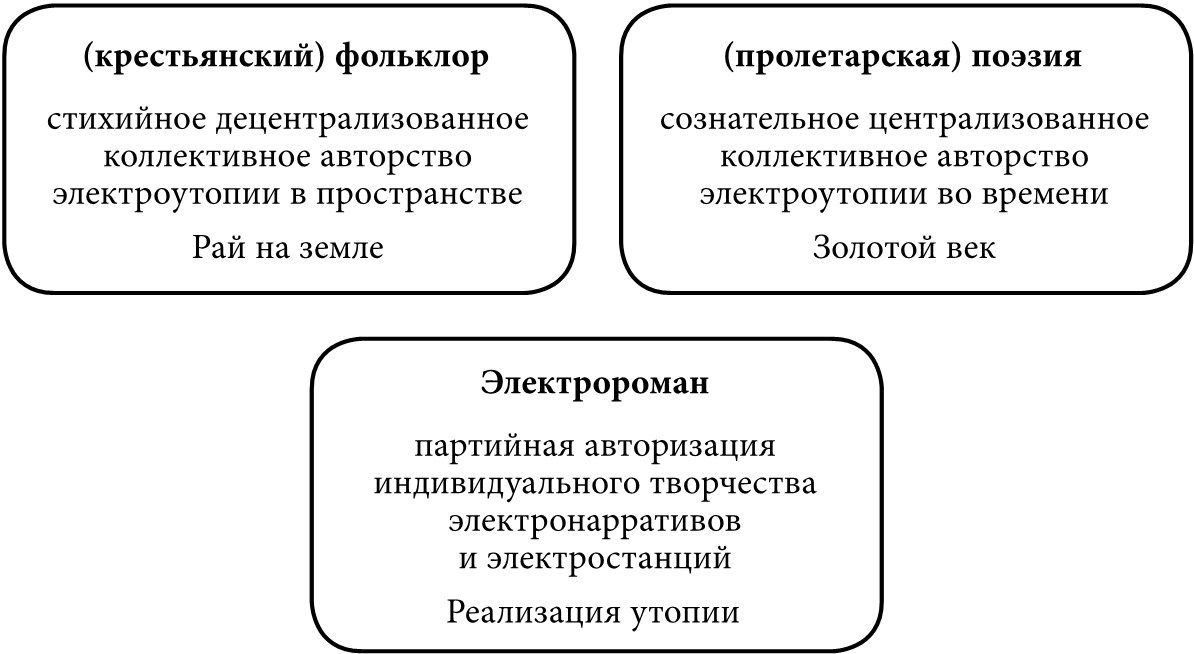 Эта модель опирается на процесс эволюции утопии как литературного жанра, представленный в свете социально-исторического анализа Карла Маннгейма: медиум утопического романа посредничает между проекциями хилиастических представлений и либерально-гуманистической идеей, между прошлым и будущим, первобытным коммунизмом и коммунистическим интернационалом. Пролетарский роман электрификации как завершенное произведение «эпохи пролетариата» посредничает и делает возможным переход от спонтанной народной воли электрификации к Золотому веку Пролетарской поэзии, которая как форма утопической репрезентации социализма возможна лишь после осуществления электрификации по модели центрального планирования.
