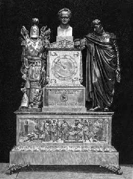 Обходя грузинский дом Аракчеева, украшенный фронтоном и колоннадами и густо обросший вековой зеленью, можно, по множеству надписей, проследить, где бывал, почивал, где занимался император Александр Павлович во время своего пребывания в Грузине. В этом доме, как святыня, сохраняются его вещи. Большего внимания заслуживают хранящиеся здесь знаменитые часы; они, после кончины императора, были заказаны Аракчеевым в Париже за громадную, по тому времени, сумму – 29,000 руб. ассигн. и должны были бить только один раз в сутки: в 10 час. 50 мин. – час кончины государя; в этот час, медленно открывается медальон императора Александра I и раздаются грустные звуки «вечной памяти». Уныло разносится звон часов по небольшой комнате, где все сохранилось в первоначальном виде, только нет более на кушетке самого Аракчеева: говорят, во время боя часов, он всегда сидел на ней. Небольшая, но мастерски исполненная бронзовая фигура его на часах полна неописуемой грусти.