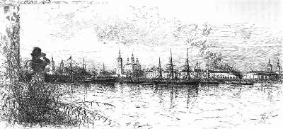 Часов около десяти, пасмурным утром, пароход приближался к средоточию нашего Севера, к Архангельску. Из храмов ближе других виднелся Архангельский монастырь с его пятью темными, почти черными вздутыми куполами; далее по берегу выдвигался собор с пятью зелеными главами, покрытыми золотыми звездами.