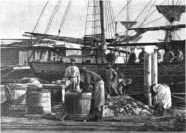 Перегрузка трески из шхуны в бочки в Архангельске.
