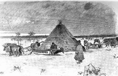 Большего внимания заслуживала выставка, устроенная здесь в 1885 году и биржевой зале. Богатство края сказалось в этой выставке весьма наглядно. Очень хорош и полон был орнитологический отдел промысловой и вообще местной птицы, морского звероловства, рыбной и лесной охоты, с образчиками и моделями силков, западней и т. п. Любопытны были изделия из дерева, котелок с цельной, вырезанной из одного куска дерева цепью, изделия из бересты, местные ткани, пряжи, зырянские деревянные замки, замши и кожи из оленьих шкур, образчики трескового жира и смолы; в совершенном загоне, на полу, помещались образчики зерна, фасовавшиеся так царственно, так самостоятельно на выставке рыбинской биржи. Характерны были можжевеловый ствол в 4 – 5 дюймов в диаметре и несколько образчиков женских головных уборов, почелков и повойников. За ткацким станком, в богатом местном одеянии, сидела за работой женщина, и против неё девочка ткала на «станине» золотую тесьму. Были тут и вещи исторического интереса: два стеклянных кубка и пивная кружка, принадлежавшие принцу Антону-Ульриху, и старое деревянное кресло Филарета Никитича Романова – из Сийского монастыря. Продуктом не местным, но очень характерным, были два рога, длиной около сажени, одного из чудовищ океанской пучины близ Шпицбергена, рыбы-однорога; прямые, но завитые винтом рога были срезаны на Новой Земле с прибитых волнами мертвых экземпляров. В заключение следует сказать, что на выставке, в садике, имелся самоедский чум, со всем его обширным населением целых трех поколений, начиная от грудного младенца включительно до деда и бабушки; посредине чума горел костер, наполняя его своим едким дымом; одетые с ног до головы в оленьи шкуры, с примесью других мехов, самоеды говорили очень порядочно по-русски; все они замечательно низки ростом; волосы в бородках и усах мужчин могут быть сосчитаны.