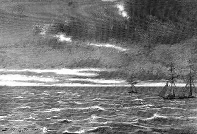 «Забияка» бросил якорь на шести саженях глубины, верстах в трех от поселения, видневшегося в глубине бухты я раскинувшегося на совершенно гладком наносе песков, скопившихся за сотни лет усилиями впадающей здесь речки Териберки. Сквозь дождь и туман довольно большое поселение обозначалось не совсем ясно; заметнее других выделялись небольшая новая церковь и домик, занятый больницей санитарного отряда архангельского благотворительного общества, под белым флагом с красным крестом. Бухта, кругловатая по плану, очень не велика, имеет около 40 сажен глубины и, как кажется, одну только песчаную банку, на которой судно и бросило якорь. Она представляется как бы чашей, бока которой состоят из скал 300 – 400 футов вышины, почти совершенно лишенных растительности; только к северо-западу и к океану принижаются они, будто один край этой чаши был когда-то кем-то сломан, разрушен и дал просвет, чтобы открыть свободный доступ северо-западному ветру. Скалы сквозь дождь и туман виднелись не особенно ясными, аспидного цвета, очертаниями, по которым тут и там нависали временные водопады. На одной из этих скал, в самой глубине залива и почти подле вершины её, обратило на себя внимание явление, оставшееся невыясненным: из земли, или, вернее, из скалы, поднимался значительный сноп водяных брызг, клонившихся султанчиком по воле ветра в ту или другую сторону.