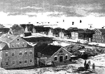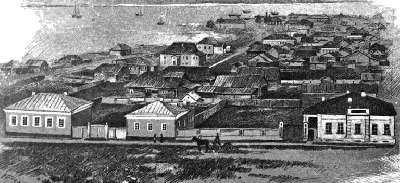 Сильно темнело, когда судно подошло, наконец, к городу, лежащему на правом берегу реки, плоском, обрывистом, песчаном. В виду его стояло на якоре пятнадцать судов, отчасти нагруженных лесом для отправки за границу, и три парохода; все они были расцвечены флагами; между ними теснилось множество лодочек, и вся набережная была усыпана людьми. Город тянется вдоль реки версты на две и, как и все скверные города, начиная от Холмогор и Архангельска, придерживается воды и имеет одну только улицу, если не считать коротеньких поперечных переулочков, поросших сочной травой, вполне пригодной под пастбище. Тундра, как и в Мезени, топорщится по улицам и здесь. В глубине, за городом, обозначались невысокие, поросшие густым лесом, холмы. В городе – 2.740 жителей, в уезде – 38.284. Следует заметить, что тут, как и в Мезени, местная интеллигенция очень немногочисленна.