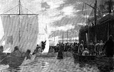 Пароход «Мезень» ожидал путников верстах в двух от города. Они пересели на него и увидели опять его покоробленную палубу и услыхали снова стук говорливой машины. По мере движения вниз по течению и следуя очень извилистым фарватером, судно делало постоянные промеры и постоянно поскребывало о дно. Путники любовались на лежавшие на боку суда, ожидавшие полной воды, для того, чтобы выпрямиться, стать как следует и выйти в море. Опять увидели они низкие берега залива, тянувшиеся полосками в бесконечную даль, его густую, илистую воду, отражавшую, но не принимавшую в себя ярких солнечных лучей. Путники направлялись прямо к привезшему их крейсеру, не замедлившему обозначиться далеко впереди, и вволю налюбовались целой флотилией белужников, собравшейся перед их глазами со всей видимой поверхности залива.