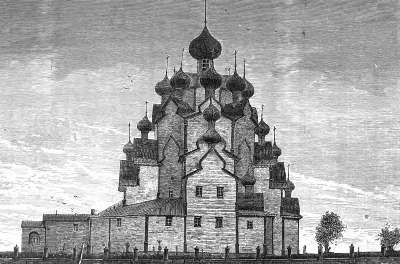 Солнце палило немилосердно, когда вдали показалась старинная церковь Вытегорского погоста, построенная по собственноручному плану Петра Великого. Церковь эта, один из перлов нашей архитектуры, чрезвычайно своеобразна: двадцать маленьких куполов, расположенных на разной высоте, группируются очень хорошо поверх зеленых крыш и белых стен. По наружным сторонам церкви, над стенами её, высятся плоские, луковице-образные кокошники, придающие зданию совершенно подходящий сельский вид. Внутри церковь невысока; плоский потолок покрывает внутренность её и от центра его лучами расходятся небольшие пояски, между которыми помещаются потемневшие изображения ангелов; иконостас, в два яруса, полон ликами святых, каждый в отдельном обрамлении.