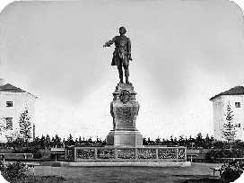Следовавший за прибытием парохода в Петрозаводск день, 14 июня, был таким же безоблачным и жарким, как все предшествовавшие. Памятник Петра Великого работы Шредера, стоящий перед губернаторским домом, ярко горел с утра своей бронзой. Он заложен 30 мая 1872 г., а открыть в 1873 г. Петр изображен во весь рост; в одной руке у него свиток, другая простерта. Постамент сделан из чрезвычайно крепкого матюковского камня. Памятник недурен; облик императора гораздо внушительнее того, который поставлен в Петергофе у Монплезира. Неудивительно, что горожане то и дело зовут приезжающих сюда туристов полюбоваться им: посмотрите, да посмотрите! Тем же Шредером сооружен здесь памятник императору Александру II, воздвигнутый местным земством. Монарх изображен стоящим в порфире; высота статуи пять аршин.