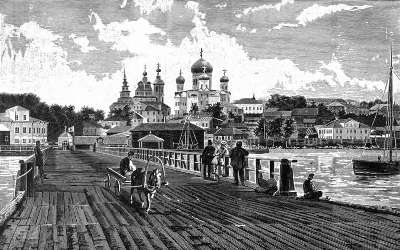 К восьми часам вечера пароход подошел к Петрозаводску. Город, с его прямыми улицами, разбитый на квадраты, разместившийся по отлогой покатости, представляется со стороны озера красивым. Высоко над всем прочим поднимается своими луковичными куполами новый собор, а подле него обозначается маленьким шпилем старейшая церковь города во имя Петра и Павла, построенная великим Преобразователем России, в 1693 году.
