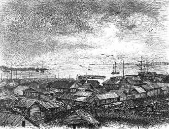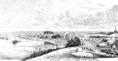 Около восьми часов утра судно приблизилось к Шлиссельбургу, последнему исторически-важному пункту в кончавшемся первом путешествии. Идя на створ маяков, оно подошло очень близко к северу-западному берегу озера, покружась достаточно между вехами, обозначающими ломаный фарватер. Шлиссельбургская крепость с её древними башнями и стенами на острове; часовенка влево с чудотворной иконой, стоящая у входа в каналы; павильон над реликвиями, оставшимися после Петра I, город с его церквами, а в глубине знаменитая Преображенская гора и здание ситценабивной мануфактуры обрисовывались одни за другими. Набережная, пристань, суда, стоявшие на рейде, все это пестрело народом.