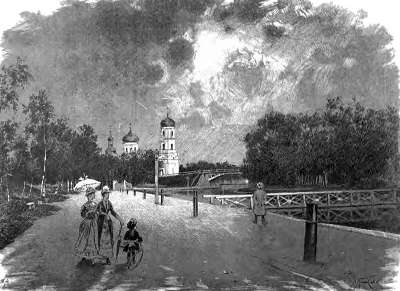 В Бежецк, на одну из станций Рыбинско-Бологовской железной дороги, путники прибыли 2-го июня, в начале 10-го часа утра, и проехали мимо старейшей церкви города, Введенской, с её небольшими синими куполами и отдельно стоящей шатровой колокольней. Внутренность собора замечательна тем, что из числа четырех массивных круглых столбов, поддерживающих барабан купола, два вошли в иконостас и закрыты его богатыми резными украшениями, вследствие чего алтарная часть церкви очень просторна, так как она занимает почти треть её.