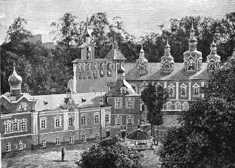 К числу замечательнейших в историческом и многих других отношениях монастырей Псковской губернии принадлежит также и Псковско-Печерский монастырь. Он находится на границе Псковской и Лифляндской губерний, в 56 верстах от Пскова, в безуездном гор. Печерах. Печерским назван по имени «пещеры», неизвестно кем ископанной и найденной в XV в. Монастырь устроен в конце XV в. С 1521 г. в нем находится чудотворная икона Божией Матери. В XVI столетии монастырь безуспешно осаждали поляки. Долгое время он служил пограничной крепостью, и последние укрепления устроены при Петре Великом. В монастыре устроена в 1827 г. церковь в память избавления псковского края от нашествия французов; построена на пожертвования гр. Витгенштейна и чинов бывших под его командой войск.