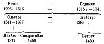 Для того, чтобы более наглядно изобразить тот, почти 150-летний, период литовской истории, в течение которого она дала своих собственных, лучших князей, – период, оканчивающийся первой, насильственной унией с Польшей в 1413 году, период в котором связь Литвы с православием и русской народностью вела ее, – так казалось, по крайней мере – к прочному объединению с возникавшей Россией, необходимо привести следующую табличку: