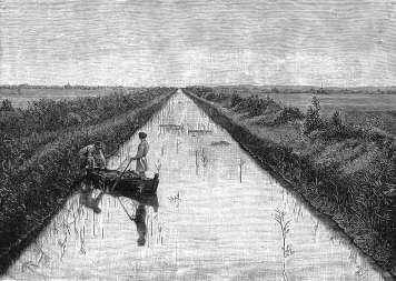 С 1874 года приступлено к работам. С 1874 по 1888 год они заключались в устройстве канализационной сети общим громадным протяжением в 2,450 верст; магистральные каналы этой сети имеют ширину от 5 до 20 аршин и глубину от 1,5 до 4,5 аршин, а боковые каналы – шириной от 3 до 5 аршин и глубиной от 1 до 1,5 аршин. Посредством этой канализации, общее и частное осушение распространилось в начале 1888 года на 1.800,000 десятин, причем на этом пространстве произошли следующие изменения, перечисление которых наглядно свидетельствует об их важности: