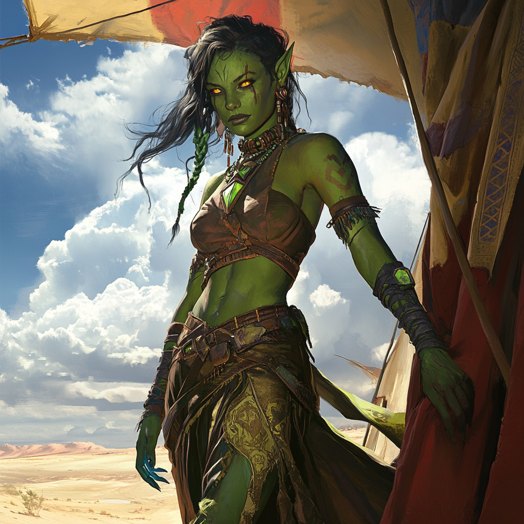 В шатёр медленно вошла орчиха. Она была будто тень от надвигающейся бури. Ни слов, ни кивков – только взгляд, тяжёлый и внимательный. Кожа – тёмно-зелёная, словно выжженная солнцем степей, с лёгким отблеском на скулах. Глаза – янтарные, цепкие, как у ястреба. Пара клыков выглядывала из слегка приоткрытого рта, прижимая её пухлые губы. Простое платье, местами затёртое от дороги, обтягивало её сильную фигуру, как вторая кожа. По бокам – глубокие разрезы, обнажающие бёдра с каждым шагом. На шее – ожерелье из многогранных кубиков, каждая грань которых окрашена в красный. Движения – точные, выверенные, без лишней суеты. Она не из тех, кто привлекает внимание – она из тех, кто не оставляет выбора, кроме как смотреть ей вслед.