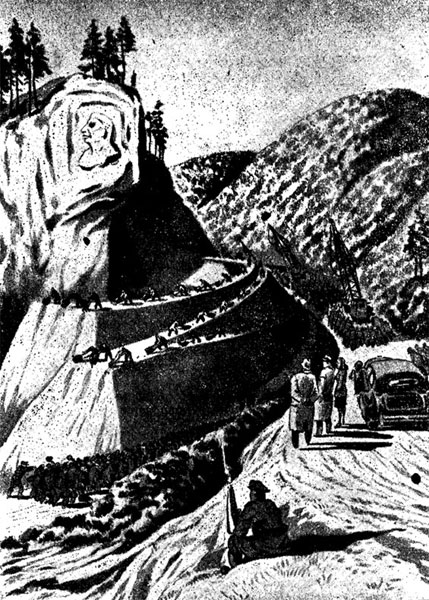 Через ветровое стекло автомобиля видна развертывающаяся в междугорьях панорама строительства железной дороги. Тысячи людей издали похожи на смертельно уставших от непосильного труда гномиков. Они ломают камни у огромной скалы и одноколесными тачками отвозят их в гигантскую коническую насыпь.