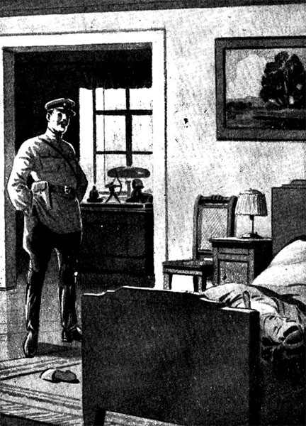 Осматривая комнату и вскрыв ящики письменного стола, он неторопливо складывает ценности и бумаги в портфель. Его внимание привлекает стоящая на столе скульптура.