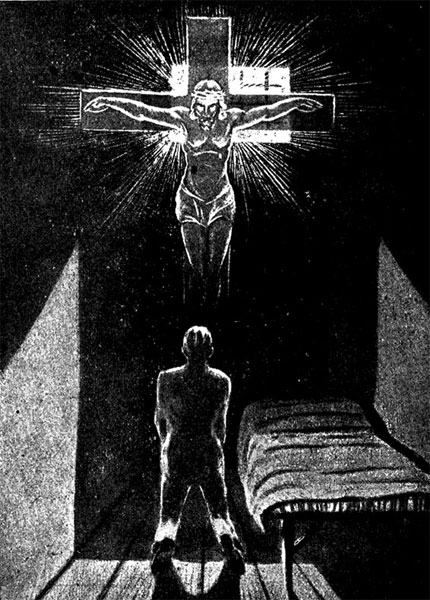 Коленопреклоненный Мак Рэд долго и горячо молится в углу своей одиночки. Ему чудится появившееся на стене прозрачное видение Распятого Христа в терновом венце.
