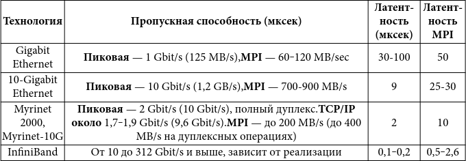 В таблице 1 приведены наиболее применяемые в кластерах сетевые технологии и их типичные характеристики. При проектировании сетей для вычислительных кластеров следует рассмотреть ещё один немаловажный вопрос – цену. Если не вдаваться в детали, то каждая сетевая карта высокоскоростной сети стоит около 1 000$, а цена коммуникатора может колебаться от 10 000$ до 1 000 000$ и выше. На сегодняшний день наиболее популярной технологией при построении кластеров для создания сетей обмена данными является технология InfiniBand. Причины её популярности связаны с хорошим соотношением между ценой и возможностями оборудования, доступностью программного обеспечения.
