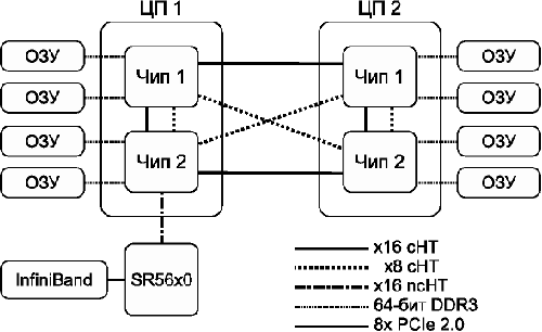 Например, в архитектуре AMD Magny-Cours (см. рис. 5) каждый процессор состоит из двух кристаллов (логических процессоров), соединённых между собой каналами HyperTransport. Каждый кристалл (чип) содержит в себе шесть вычислительных ядер и свой собственный двухканальный контроллер памяти. Доступ в «свою» память идёт через контроллер памяти, а в «соседнюю» – через канал HyperTransport. Как видим, построить SMP– или NUMA-систему из двух или четырёх процессоров вполне возможно, а вот с большим числом процессоров – уже непросто.