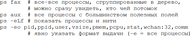 Посмотреть список процессов и их состояние можно с помощью команды ps. У неё нелёгкая судьба, т. к. в разных вариантах популярных ОС (Unix, BSD, Solaris) исторически у неё было много разных, в том числе конфликтующих опций. В результате в Linux используется вариант GNU, который пытается их сочетать. В частности, есть опции, которые обязательно надо указывать с минусом впереди, а другие – наоборот только без минуса. Ниже самые полезные с нашей точки зрения: