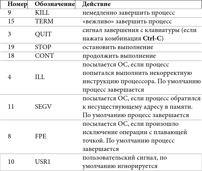 Таблица 3: некоторые сигналы в Linux