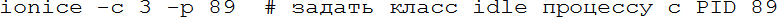 Кроме очереди на ресурсы процессора есть очередь к ресурсам жёстких дисков, несколько процессов могут одновременно читать-писать, и их запросы будут конкурировать. В этой очереди тоже есть приоритет, им управляет команда ionice. Есть три класса приоритетов – idle (выполнять запрос, если больше никого в очереди нет), best effort (нормальная очередь) и real time (запрос должен быть выполнен за заданное время). Внутри классов, кроме idle, есть собственные приоритеты, но в наших задачах можно ограничиться назначением класса idle процессу, занимающему много времени на дисковых операциях, но не приоритетному:
