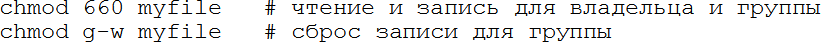 В символьном виде для chmod указывается один или более символов 'u/g/o/a' (владелец, группа, остальные, все три группы вместе), затем символ '+' или '-' для установки или сброса прав, и затем один или более символов 'r/w/x' – какие права затрагиваются. Например, chmod go+rx myfile добавит права на чтение и исполнение для группы и остальных файлу myfile.