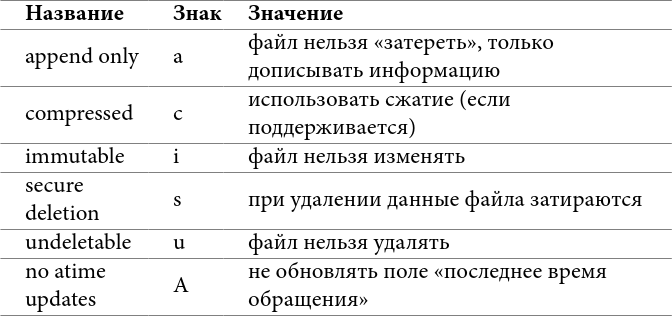 Описанная выше система покрывает множество потребностей, но не все. В попытках улучшить её были созданы различные расширения, реализованные в файловых системах Linux. Одно из них – расширенные атрибуты файлов. Они включены по умолчанию, и их можно смотреть и изменять командами lsattr и chattr. Самые важные для нас:
