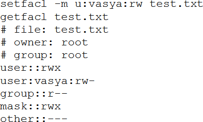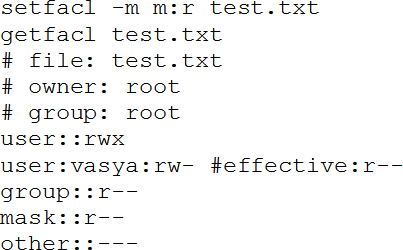 Здесь ключ '-m' указывает модифицировать правила acl. Указав ключ '–set', можно заменить правила, т. е. удалить старые и заменить новыми (в setfacl можно указать несколько правил одновременно). Ключом '-x' правила можно удалять. Строка 'u:vasya;rw' указывает на то, что правило относится к пользователю (u = user, g = group, o = others), его и<я vasya, и устанавливаются права на чтение и запись. Теперь установим маску – разрешим пользователю vasya (и другим, имеющим доступ через правила acl) «не более чем» чтение: