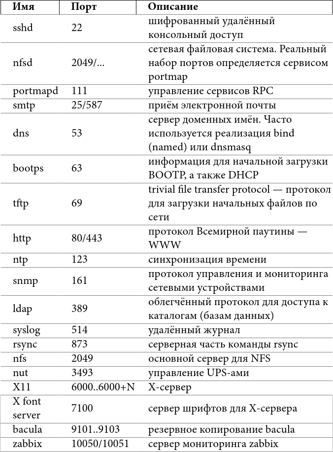 Более полный список можно найти в файле /etc/services – он содержит соответствие номера порта традиционно используемому сервису. Некоторые сервисы в нём не представлены ввиду не очень широкого распространения, и, конечно, ничто не мешает запустить какой-либо сервис на нестандартном порту, не забывайте об этом. Через супердемон inetd/xinetd часто запускаются такие сервисы, как tftp, echo, ftp.