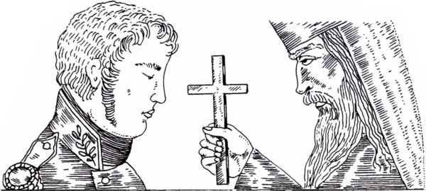 Когда двери кельи растворились, мрачная картина предстала глазам императора. Весь пол и стены до половины были обиты траурным сукном. У левой стены виднелось большое распятие; напротив – длинная деревянная скамья, вся черная. Горевшая лампада тускло освещала это суровое жилище аскета. Схимник пал перед распятием и, обратившись к Александру, сказал: «Государь, молись». Император положил три земные поклона, и схимник осенил его крестом. Разговаривая с митрополитом, Александр тихо спросил, где спит схимник, ибо постели не было видно. Митрополит указал на место перед распятием Но схимник, услыхав ответ митрополита, поправил его: «Нет, государь, и у меня есть постель, пойдем я покажу тебе ее» – и, встав, провел государя за перегородку. Там на столе Александр увидел черный гроб, в коем лежали схима, свечи, ладан и все погребальные принадлежности. «Смотри, – обратился к нему схимник, – вот постель моя. И не моя только, а постель всех нас. В ней все мы, государь, ляжем, и будем спать долго».