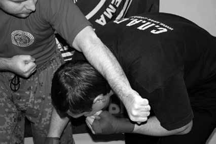 Но вот на вас летит нога в «гриндерсе» или рука с ножом… Выставьте руки, отбивая атаку, и одновременно наклоните закрепощенный корпус вперед, уперевшись головой в противника.