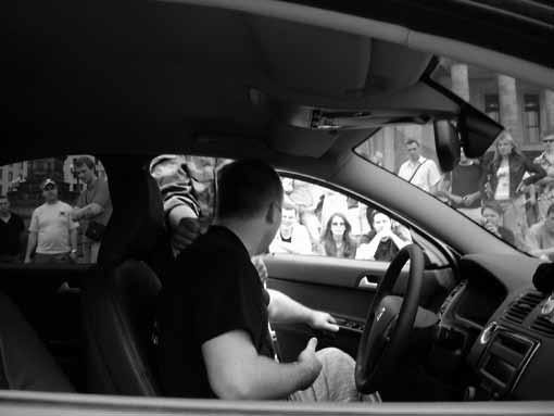 • если все-таки вы не успели среагировать на нападение и противник рядом и пытается напасть, машина – ваша защита. Прикройтесь дверью, отпихиваясь ногами, сядьте на сиденье: вытащить человека из узкого пространства очень трудно, так же как и нанести ему удар, поскольку у нападающего нет возможности сделать замах. Отбивайтесь всем, что есть под рукой, хватайтесь за рулевое колесо (баранку), кресло, кидайте все, что можете, но ни в коем случае не выходите из машины, даже если противник один: есть большая вероятность, что его друзья рядом. По возможности уезжайте или привлеките к себе внимание сигналом (гудком);