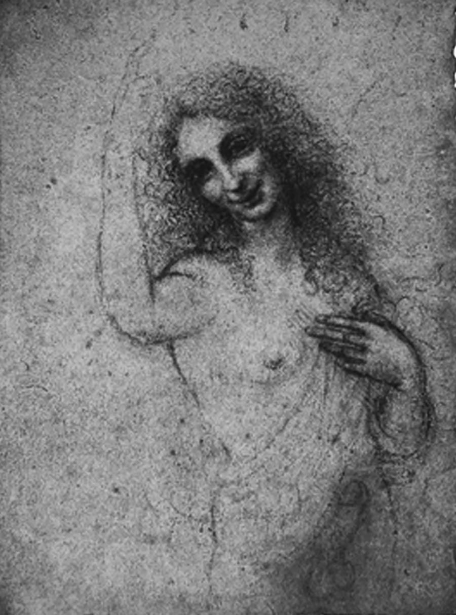 Леонардо также привлекал сюжет смешения полов: он создает серию эротических рисунков, среди которых мы наблюдаем и образы ангелов. Один из них даже хранится в коллекции английской королевской семьи. Королева Виктория, известная поборница нравственности, тем не менее держит эти и прочие рисунки у себя в Виндзорском замке. В середине XIX века наиболее скандальные из изображений таинственным образом исчезают из королевского собрания, к большому облегчению представителей царствующей династии. Однако одно из них было вновь обретено в 1991 году в одной из частных коллекций в Германии, благодаря любопытству и усилиям исследователя Карло Педретти (см. рис. ниже). Данный образ с полным правом может называться предшественником ангелов Караваджо: тот же наклон головы, взъерошенные кудри, та же коварная ухмылка. Одной рукой персонаж придерживает ниспадающую мантию, другой указывает на небеса. На этом, однако, тосканский художник не останавливается, доводя до максимума соблазнительную силу своего персонажа: ангел демонстрирует обнаженную женскую грудь и одновременно мужской половой орган в состоянии эрекции. Эту постыдную деталь какой-то неизвестный даже попытался стереть абразивом, поэтому она видна не так отчетливо. Произведение каким-то чудом пережило эпоху Контрреформы – скорее всего, благодаря тому, что находилось в частных собраниях и было знакомо художникам последующих поколений только по репродукциям.
