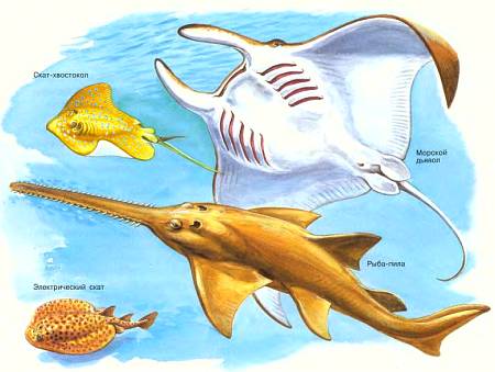 Морской дьявол обитает в теплых морях. Размах его плавников достигает 7 м. По сравнению с ним 2-метровый скат-хвостокол и 60-сантиметровый обыкновенный электрический скат из Восточной Атлантики кажутся почти безобидными существами. Рыба-пила внешне похожа на акулу, но сросшиеся с головой грудные плавники и жаберные щели на нижней стороне тела говорят о ее принадлежности к отряду скатов.