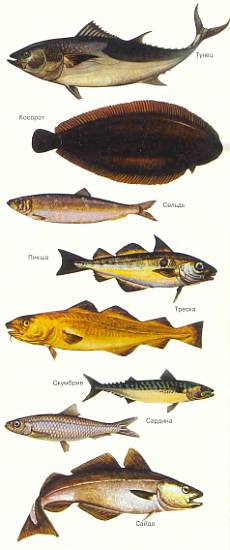 Морские рыбы живут почти исключительно в соленой воде морей и океанов или в слабосоленой воде вдоль берегов или в устьях рек. На картинках справа показаны некоторые промысловые рыбы.