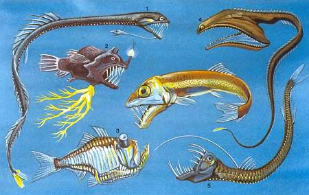 В морских глубинах обитают миниатюрные (от 10 до 20 см) чудовища: идиакант(1), удильщик линофрина(2), топорик(3), большерот пеликановидный(4) и хаулиод(5). Самка линофрины привлекает жертв «удочкой» со светящейся «приманкой» и светящимся древовидным придатком. Здесь изображена самка линофрины. Самцы этого вида гораздо меньше самок и паразитируют на них (приросший самец виден на рисунке).