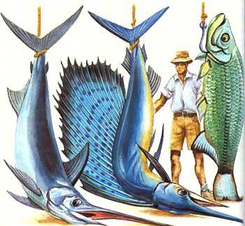 Слева направо висят над палубой излюбленные объекты спортивного рыболовства: меч-рыба, парусники атлантический тарпон. Меч-рыба (до 4 м) и парусник (до 3,5 м) встречаются во всех крупных морях.