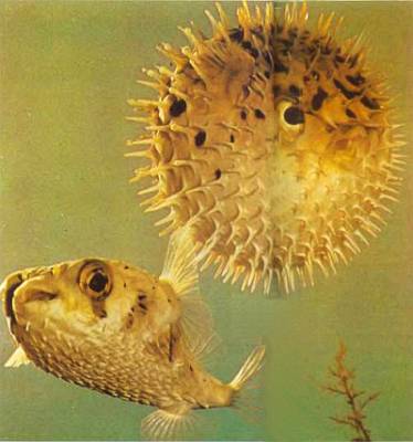 Самым необыкновенным образом защищаются от назойливых хищников иглобрюхи и ежи-рыбы, также принадлежащие к отряду иглобрюхообразных. Подплыв к поверхности воды, иглобрюх быстро втягивает в себя воздух и превращается в неподвижный колючий шар. Когда он выпускает воздух, то раздается барабанный звук. На глубине иглобрюх заглатывает воду и опускается на дно. Многие иглобрюхи ядовиты. Яд содержится у них в коже, брюшине, печени, икре и молоках.