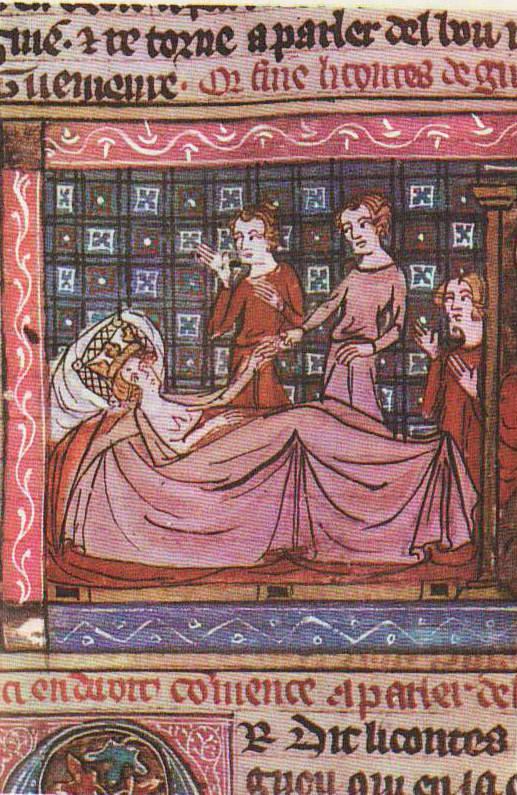 Однажды Тристан лежал в своей постели, такой исхудавший и бледный, что жалость брала всякого, кто бы на него ни взглянул. И была подле него одна дама, и горько оплакивала она его, и говорила:
